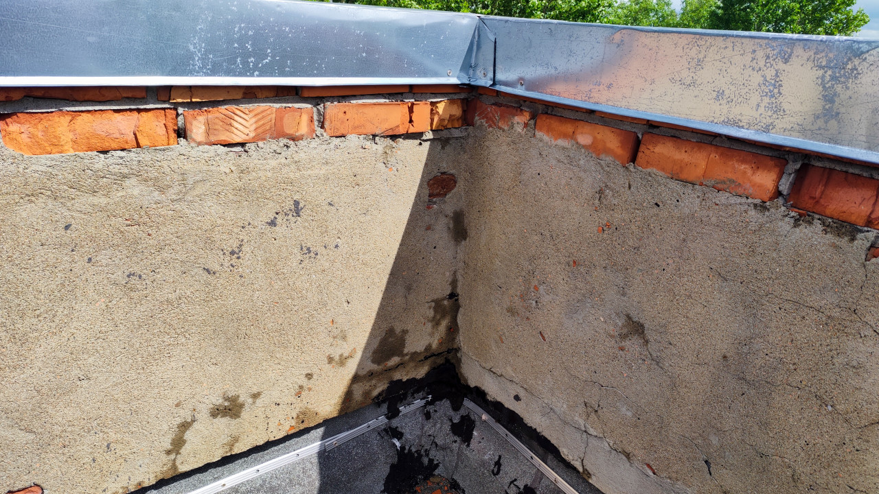 Фотография показывает внутренний угол кирпичной стены на крыше многоэтажного дома. На стене заметны трещины и следы влаги, а нижняя часть кладки покрыта черными пятнами, указывающими на воздействие влаги и возможные протечки. Верх стены укреплен металлическим элементом. В кадре присутствует часть рулонного покрытия крыши. Снимок сделан в дневное время при солнечной погоде. Исторической или культурной значимости объект не имеет. Изображение может быть использовано в материалах о технических дефектах жилого фонда, ремонте кровель и обследовании состояния зданий.