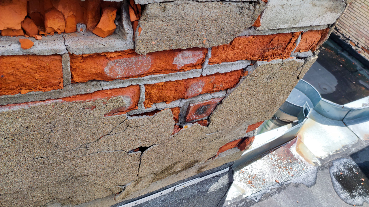 На снимке изображен фрагмент кирпичной стены на крыше жилого здания. Красные кирпичи частично разрушены, цементные швы имеют трещины, а наружный слой штукатурки осыпался и потрескался. На стене видны следы старых ремонтных работ и неровности кладки. В нижней части заметна кровля и металлический элемент водоотвода. Съемка проведена при дневном свете. Культурных или исторических объектов на фото нет. Снимок подходит для иллюстрации статей о строительных дефектах, ремонте фасадов и кровель, а также в материалах о техническом состоянии жилого фонда.