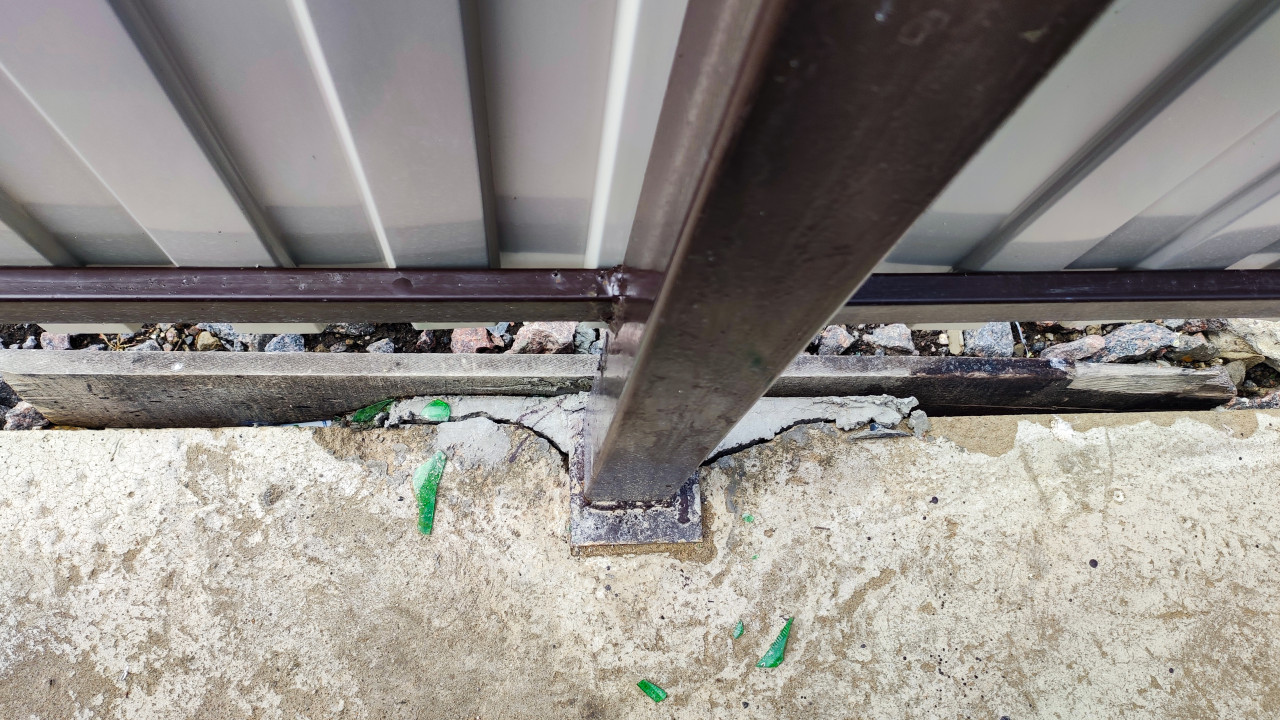 На фото изображена вертикальная металлическая опора коричневого цвета, закреплённая на бетонной площадке. Основание конструкции имеет заметные трещины и разрушения, в том числе сколы по краям. Рядом видны куски щебня, деревянная рейка и зелёные фрагменты стекла, что указывает на уличные условия и возможные строительные работы. Данный снимок фиксирует технические недостатки крепления ограждения и может использоваться для иллюстраций тематики строительного контроля, ошибок монтажа или необходимости ремонта ограждений.