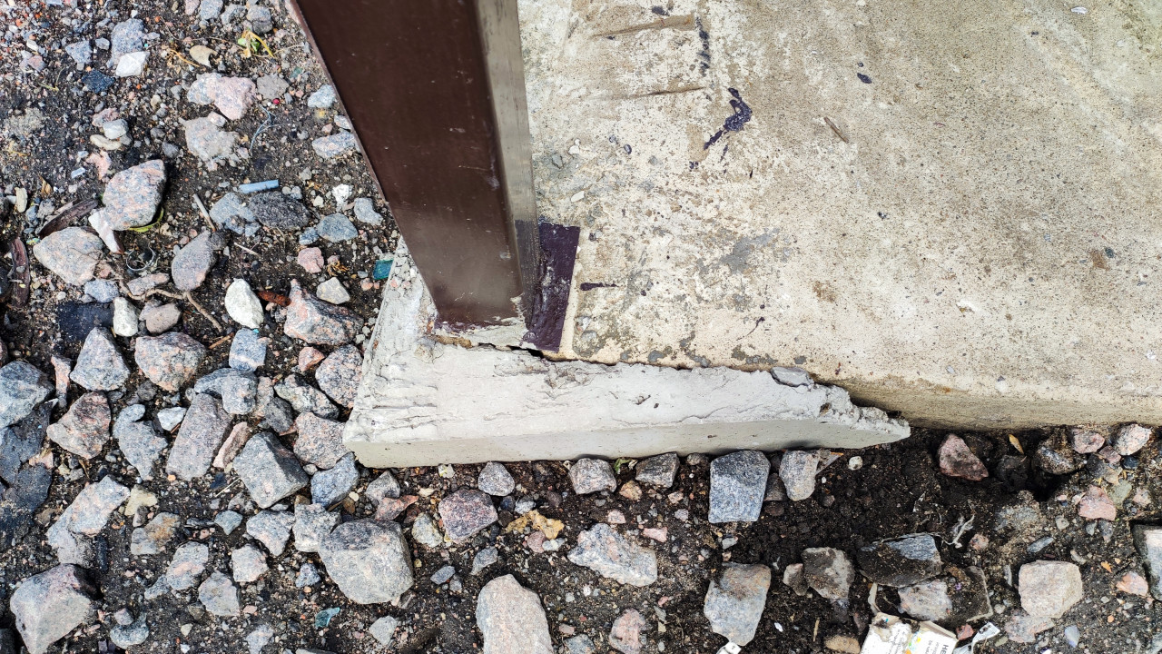На фотографии изображена металлическая квадратная опора коричневого цвета, закреплённая в бетонное основание. Бетон частично повреждён и имеет сколы по краям. Вокруг конструкции виден щебень, камни и грунт, что указывает на расположение на улице. Данный кадр фиксирует строительный элемент вблизи поверхности земли, демонстрируя техническое состояние конструкции. Фото может использоваться в иллюстрациях, связанных со строительством, ремонтом, контролем качества работ и демонстрацией дефектов фундамента.