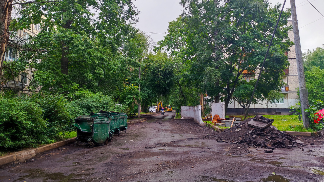 дорога ремонт благоустройство дорожные работы строительные работы городская среда инфраструктура уличная среда демонтаж асфальт ремонт дороги контейнеры мусор техника рабочие двор жилой дом дождь лужи деревья зелень Россия дворовая территория капитальный ремонт подъездная дорога бордюр утилизация асфальта ремонт покрытия жилой квартал благоустройство двора двор после дождя строительная техникаПохожие фотографии