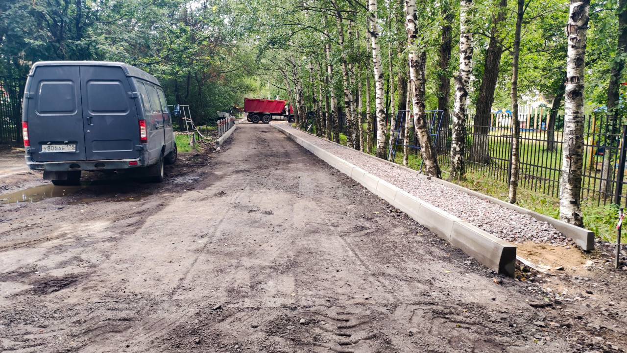 Фотография показывает участок дороги с установленным новым бордюром, вдоль которого насыпаны щебень и песок для подготовки к дальнейшему ремонту. На обочине припаркован серый фургон, а в конце улицы виден красный самосвал. Дорогу окружают деревья и металлическое ограждение. Снимок отражает этап ремонта и благоустройства дворовой территории. Культурных или исторических объектов на фото нет. Материал подходит для иллюстрации инженерных работ и дорожного строительства.