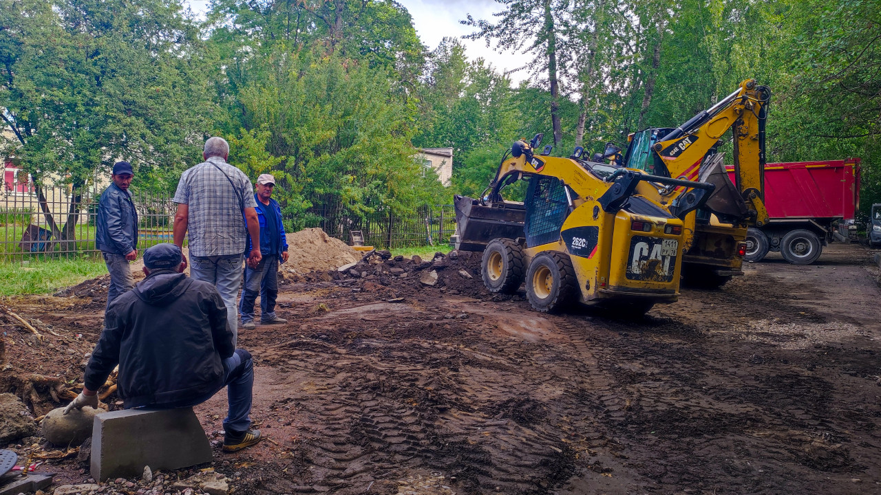 На фото изображён участок дороги в процессе ремонта: несколько рабочих находятся рядом с мини-погрузчиком CAT и экскаватором, выполняющими земляные работы. На заднем плане стоит грузовик с открытым кузовом для вывоза грунта. На поверхности дороги видны следы от колёс техники и земляные массы. Территория окружена зелёными насаждениями и металлическим ограждением. Объектов культурного наследия в кадре нет. Снимок может использоваться для иллюстрации процесса дорожного строительства, подготовки и благоустройства территории.