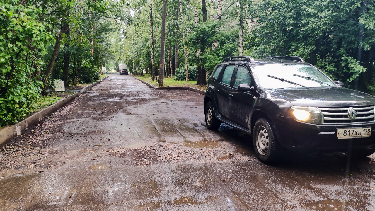 Дворовая дорога без асфальта с припаркованным автомобилем