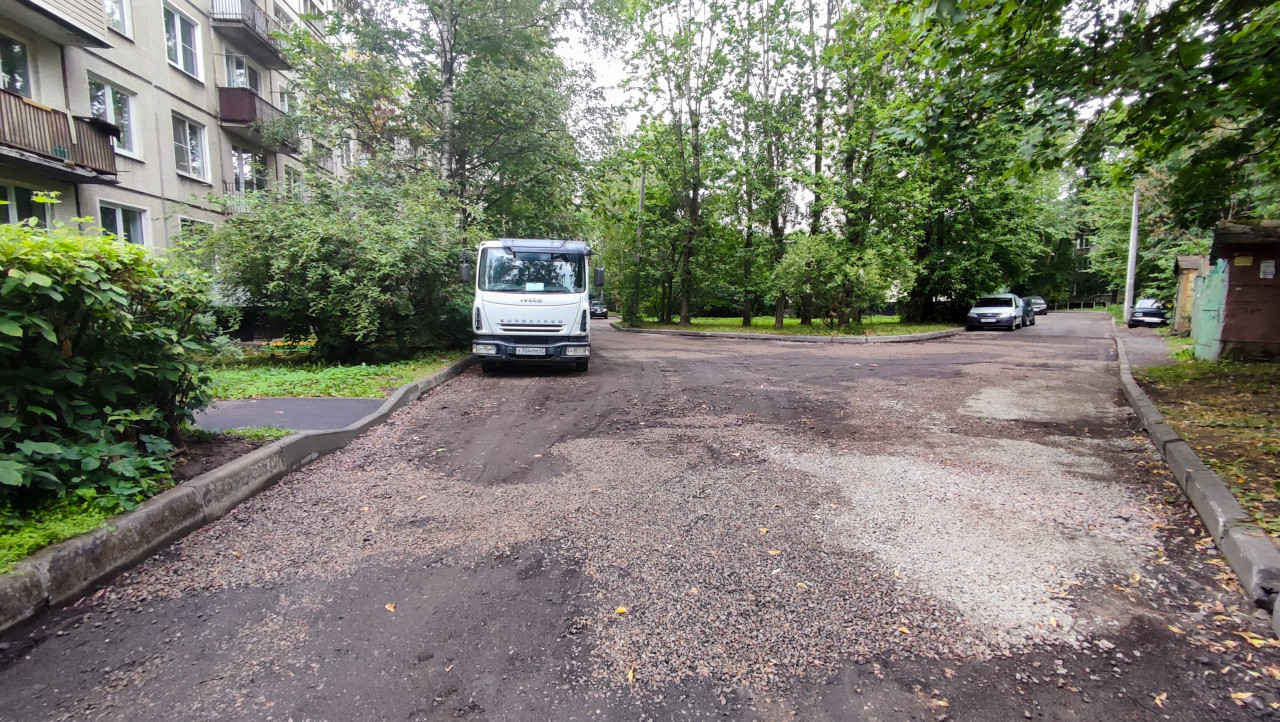 На фотографии изображена придомовая дорога с частично засыпанным щебнем и следами ремонта. На переднем плане стоит белый грузовик IVECO Eurocargo, припаркованный у обочины. Вокруг расположены многоквартирные дома, кустарники и деревья. Сцена демонстрирует этап благоустройства дворовой территории в жилом квартале и может быть использована для материалов о строительстве, ЖКХ и эксплуатации городских территорий.