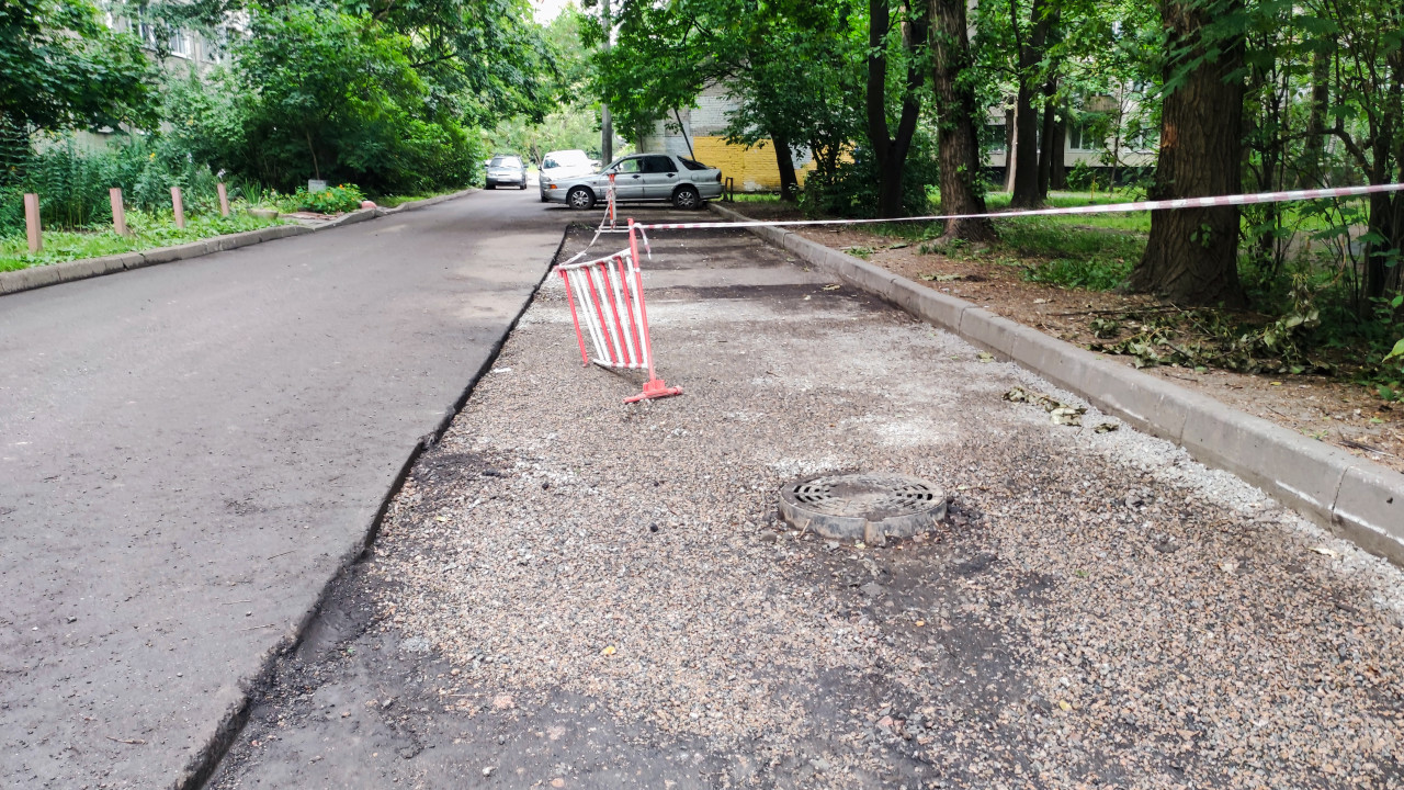 На фотографии изображен участок двора, где ведутся дорожные работы. Справа выделена зона парковки, покрытая щебнем, на которой виден люк коммуникаций, выступающий над поверхностью. Для ограждения установлен временный пластиковый барьер с сигнальной лентой. По краям видны свежие бордюры, слева — асфальтированная дорога, справа — зеленая зона с деревьями. Сцена отражает промежуточный этап ремонта дворовой территории и может использоваться в материалах о благоустройстве, инженерных коммуникациях и безопасности дорожных работ.