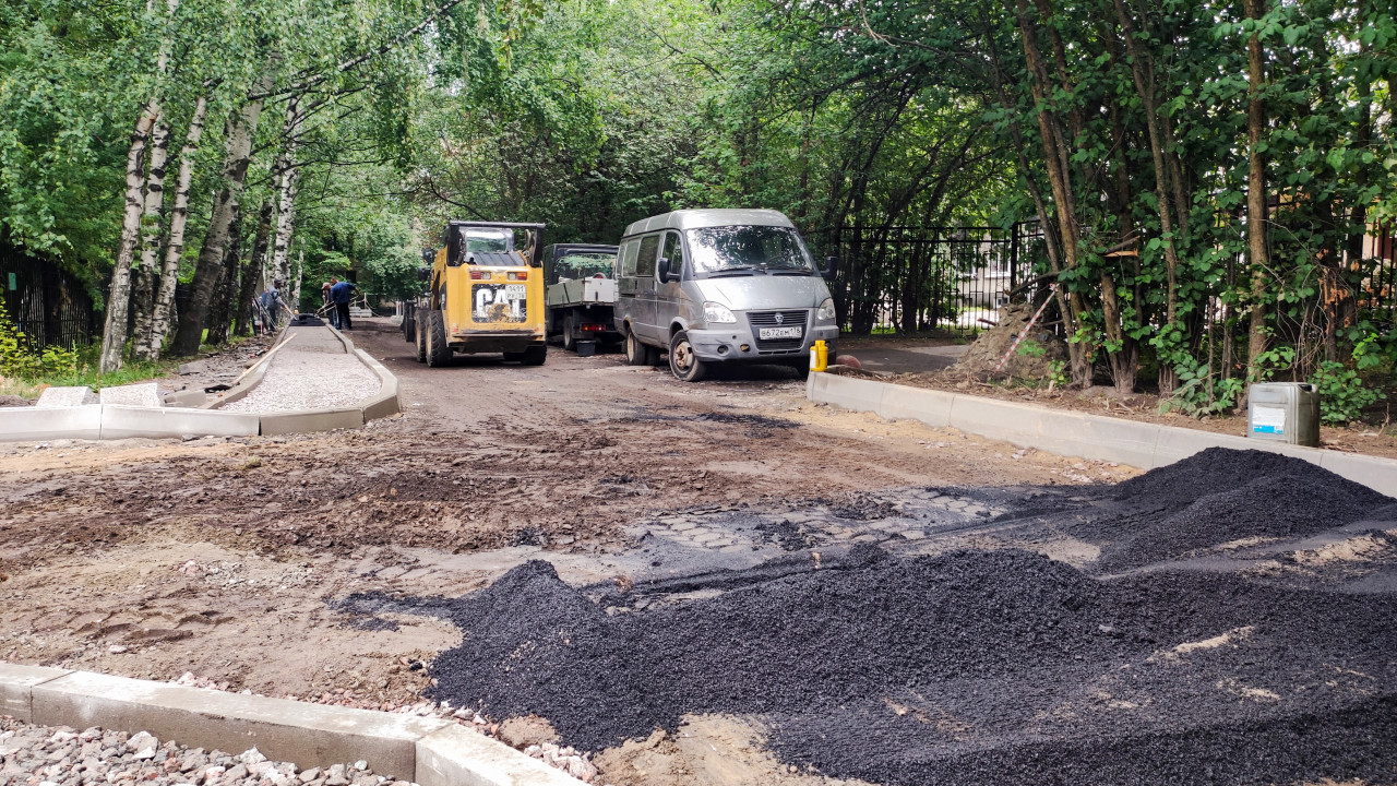 На фото показан процесс асфальтирования дороги во дворе. В центре кадра находятся дорожная техника и рабочие, рядом припаркован автомобиль. На переднем плане высыпаны кучи асфальта, по краям установлены новые бордюры, а поверхность дороги частично подготовлена к укладке. Слева заметны берёзы и металлическое ограждение. Фотография демонстрирует процесс благоустройства и может применяться для иллюстрации дорожного строительства, городских проектов и контроля качества выполненных работ.
