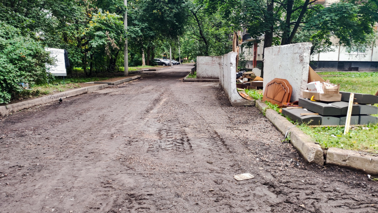 На фото показан двор жилого массива в процессе благоустройства: проезжая часть очищена от старого покрытия, видны следы от техники, а по сторонам уложены новые бордюры. Справа находится склад строительного мусора и материалов, включая бетонные блоки и панели. Слева установлена информационная табличка о проводимых работах. В кадре много зелени, деревья формируют тенистую аллею. Фотография демонстрирует процесс дорожных и дворовых работ, может применяться для иллюстрации реконструкции жилых территорий и городской инфраструктуры.