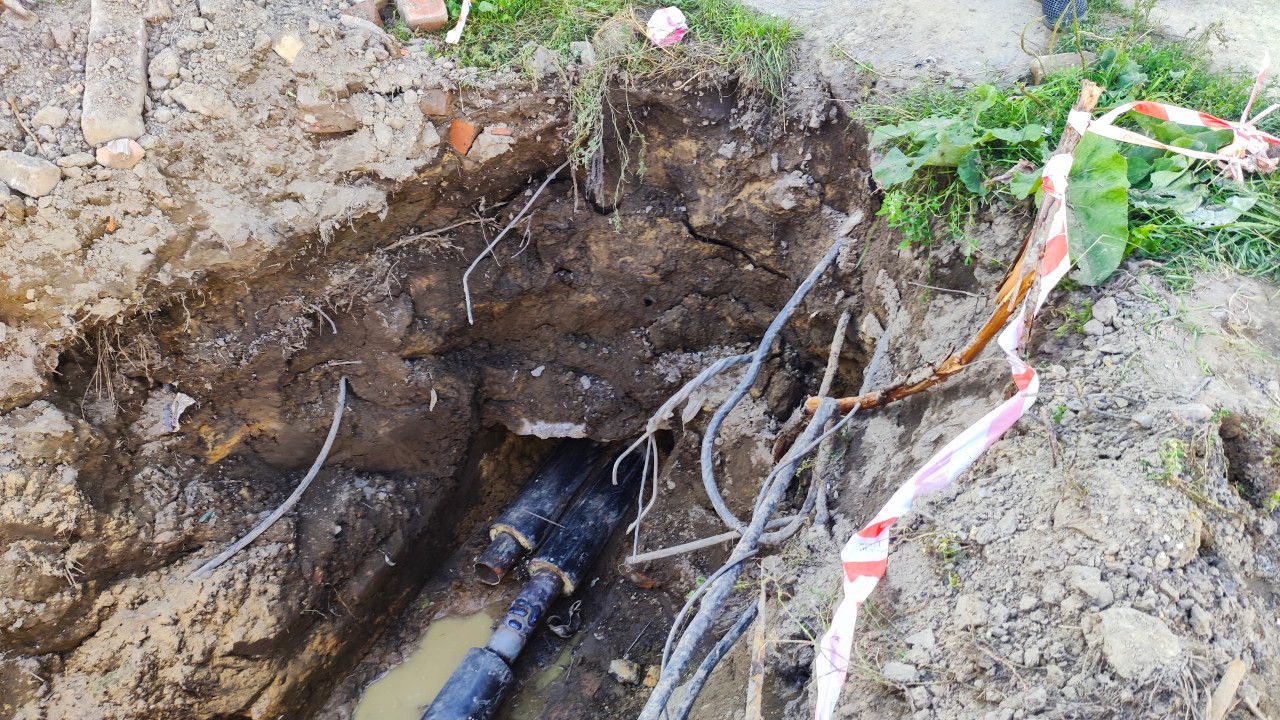 На фотографии показан котлован с проложенными трубами и кабелями. Внизу видны трубы, частично находящиеся в воде. По бокам траншеи заметны корни и провода. Край ограждён сигнальной лентой, закреплённой на деревянных колышках. Снимок фиксирует аварийные или ремонтные работы на участке инженерных сетей.