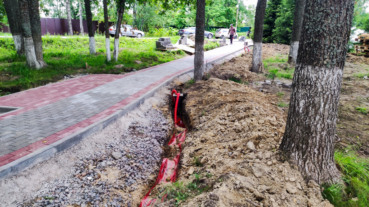 На фотографии показана траншея, проходящая вдоль нового тротуара из тротуарной плитки. Внутри траншеи уложены кабели в красных гофрированных трубах, сверху размещена защитная лента. Сбоку видны деревья и насыпи грунта, а также участки благоустройства территории. На заднем плане заметны пешеходы и припаркованные автомобили. Снимок отражает процесс строительства и монтажа подземных инженерных сетей в городской среде. Может использоваться для тематики инфраструктуры, благоустройства и электрификации.