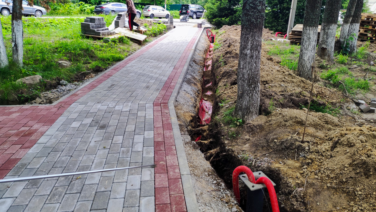 На фотографии показана траншея, вырытая вдоль нового тротуара, выложенного серо-красной тротуарной плиткой. Внутри проложены красные гофрированные трубы для кабелей, сверху размещена красная защитная лента. По краю видны деревья с побелёнными стволами и насыпи грунта, рядом лежат деревянные поддоны и строительные материалы. Снимок отражает этап строительства и благоустройства территории. Изображение может быть использовано для тематики инженерных коммуникаций, электрификации и городских работ.