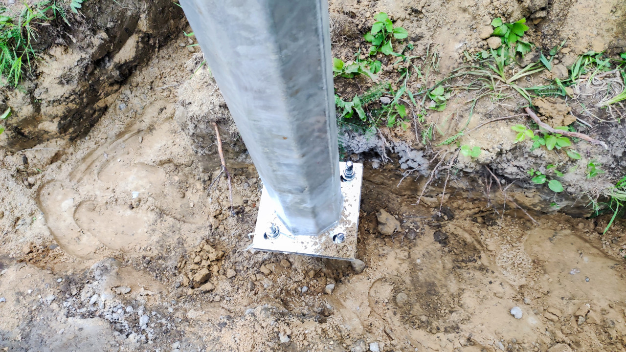На фотографии показано основание металлической опоры, закреплённое на фундаментной плите с помощью болтов. Опора установлена в траншее среди грунта, видны корни растений и следы земляных работ. Снимок сделан в процессе монтажа уличного освещения или инженерных конструкций. Исторической или культурной значимости объект не имеет. Фото может использоваться в материалах о строительстве, монтаже опор, благоустройстве территорий и инженерных работах.
