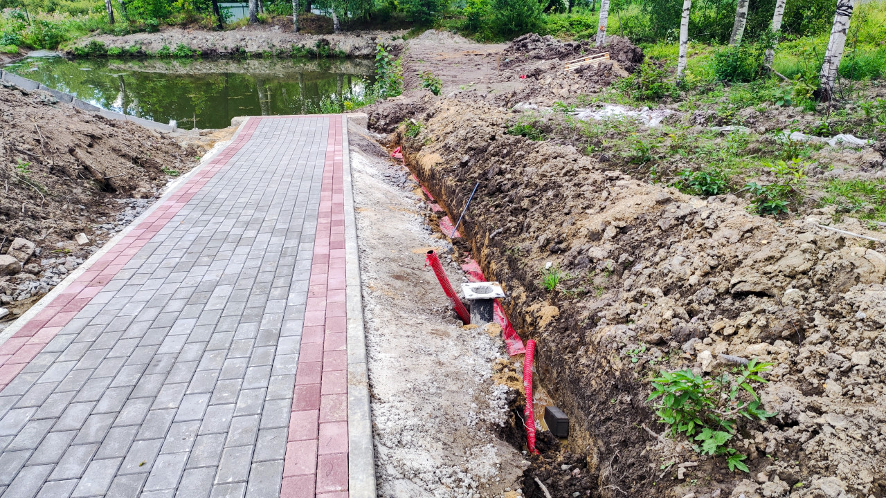 На изображении показан новый тротуар, проложенный вдоль берега водоёма. Рядом вырыта траншея, в которой уложены красные гофрированные трубы для кабелей и защитная лента. На поверхности заметны земляные насыпи и элементы благоустройства территории. На заднем плане виден водоём и зелёные насаждения. Снимок фиксирует этап строительства инженерных сетей в парковой или прибрежной зоне. Может использоваться для тематики благоустройства, инженерных коммуникаций и городской инфраструктуры.