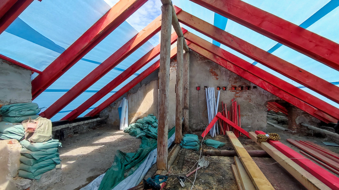 На фото изображён чердак здания, где ведутся работы по капитальному ремонту крыши. Установлены новые деревянные балки и стропила, окрашенные красным защитным составом, а сверху закреплена временная плёнка для защиты от осадков. В помещении лежат строительные материалы и инструменты, включая доски, мешки и пластиковые трубы. Сцена иллюстрирует этап реконструкции кровли жилого дома. Фотография может использоваться для статей и материалов о строительстве, ремонте и архитектурных проектах.