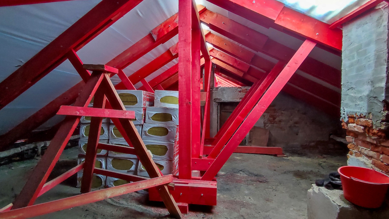 На фото показан чердак жилого дома в процессе капитального ремонта кровли. Видны деревянные стропильные конструкции, обработанные красным антисептическим раствором. Вдоль стены сложены упаковки утеплителя, предназначенного для изоляции крыши. Слева установлен временный деревянный помост, а справа в кадре видна часть кирпичной кладки старой стены и красное пластиковое ведро. Пространство освещается естественным светом, проходящим через кровельное покрытие. Исторической или культурной значимости данный объект не имеет. Фотографию можно использовать в иллюстрациях о строительных процессах, реконструкции и утеплении крыш.