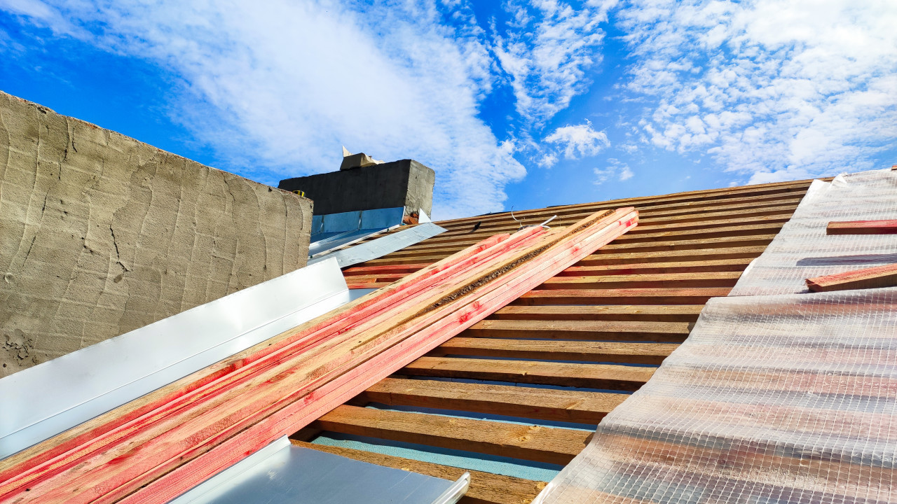 На фотографии показан процесс ремонта крыши жилого здания. Видна деревянная обрешётка, обработанная антисептиком, уложенные доски, а также металлические элементы конструкции. На правой стороне кадра частично заметна гидроизоляционная плёнка белого цвета, защищающая нижние слои кровли. В верхней части фото выделяется голубое небо с редкими облаками. Съёмка демонстрирует ранний этап реконструкции кровли перед укладкой финишного покрытия. Культурных и исторических объектов в кадре нет. Фото можно использовать в иллюстрациях о строительстве, ремонте и учебных материалах для кровельщиков.