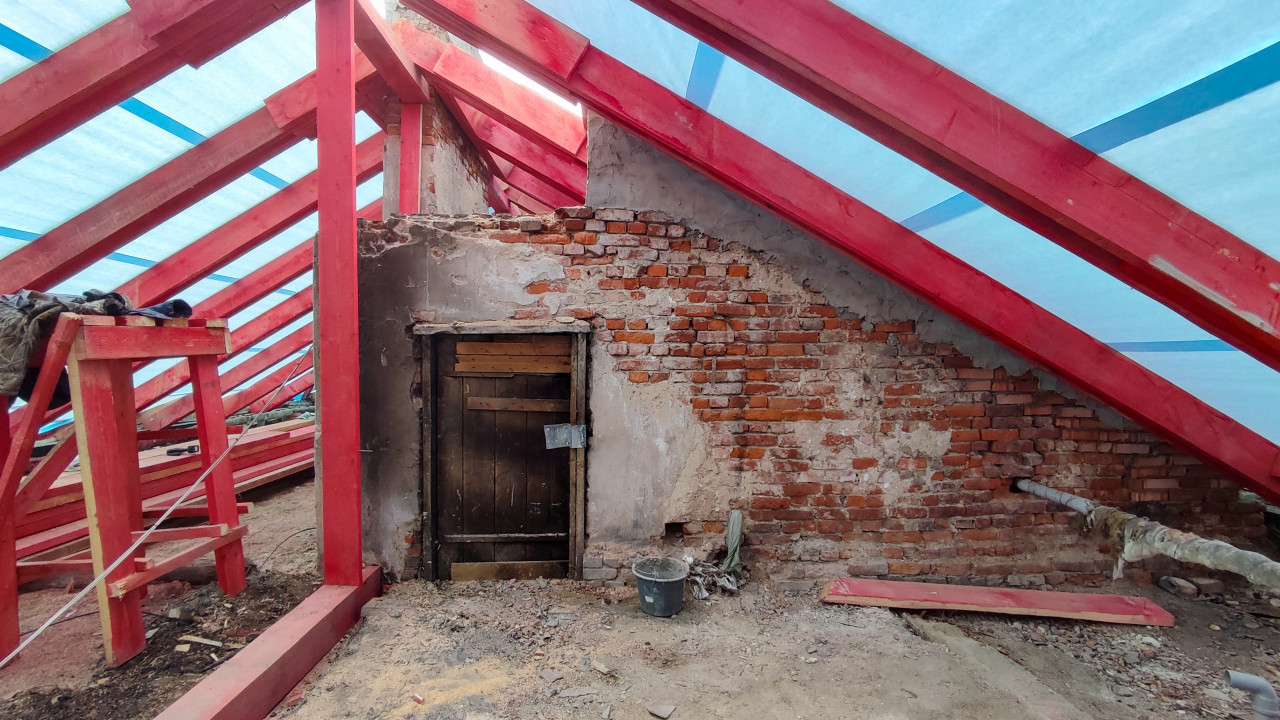 На снимке изображено внутреннее пространство крыши в процессе ремонта или строительства. Красные деревянные стропила удерживают голубую мембрану, образующую временное покрытие. На переднем плане — старая кирпичная стена с частично разрушенной штукатуркой и деревянной дверью, закрытой металлической планкой. На полу лежат строительные материалы, ведро и остатки раствора. Культурной ценности объект не представляет. Фотография подходит для публикаций о ремонте зданий и демонстрации сочетания старых и новых строительных элементов.