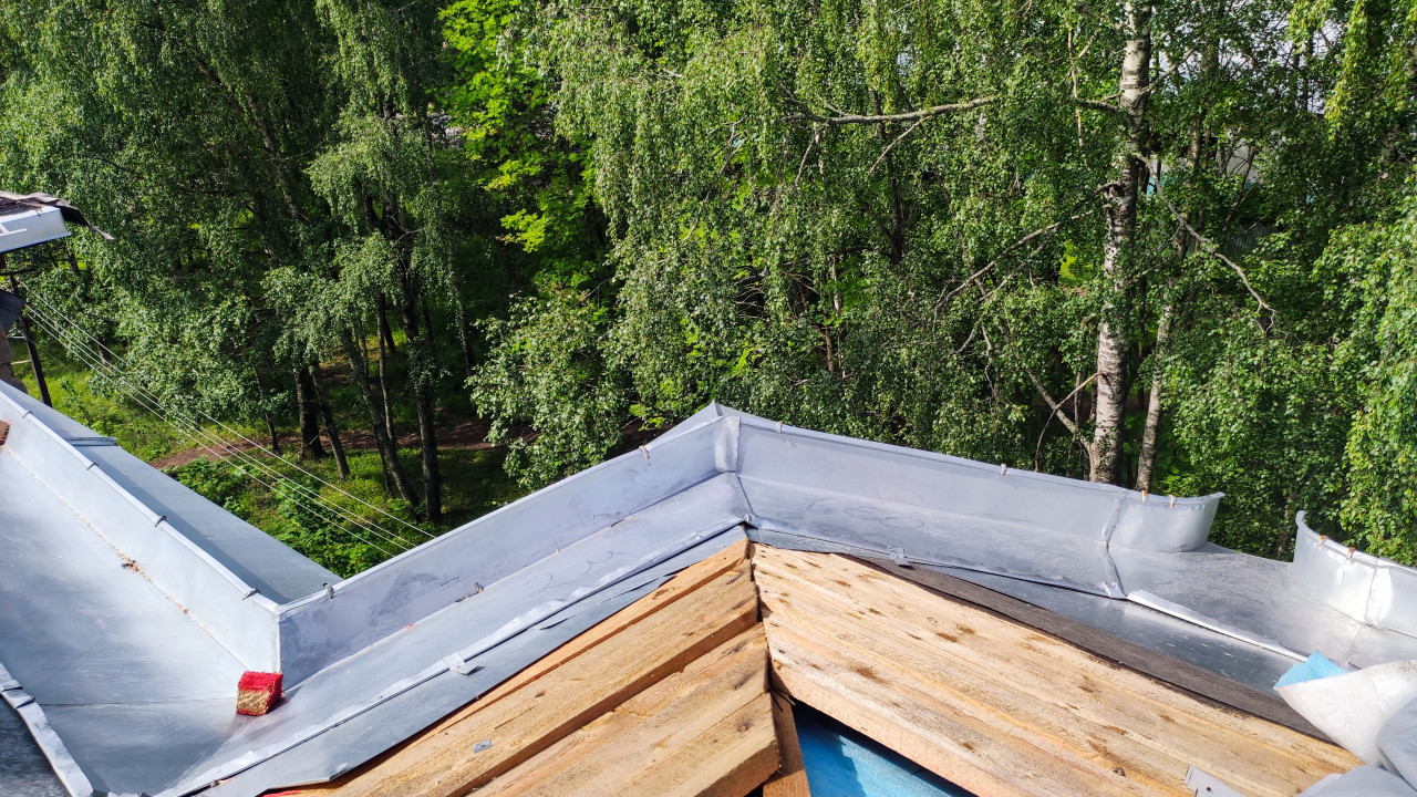 На фото запечатлён узел водоотвода в месте соединения скатов крыши многоквартирного дома. Видна деревянная обрешётка с частично уложенной гидроизоляцией синего цвета, а также металлический жёлоб, закреплённый в нижней части конструкции. По краям жёлоба заметны крепёжные элементы и временные деревянные упоры. На заднем плане видна зелёная листва деревьев, что указывает на расположение дома в жилой зоне. Исторической или культурной ценности данный объект не имеет. Фото можно использовать для учебных и технических материалов по строительству и ремонту крыш.