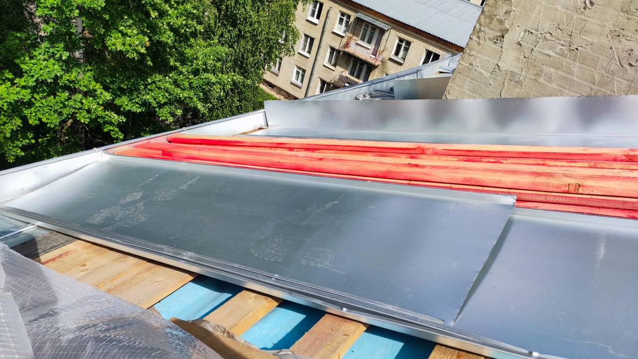 На фото зафиксирован фрагмент крыши жилого здания в процессе ремонта. Видны металлические листы, уложенные поверх деревянной обрешётки, а также обработанные антисептиком деревянные брусья красного оттенка. На заднем плане заметна зелёная листва деревьев и часть фасада соседнего дома. Съёмка произведена при ярком солнечном свете, что подчёркивает текстуру материалов. Объект не представляет культурно-исторической ценности, это строительный процесс капитального ремонта крыши. Изображение можно использовать в иллюстрациях о монтаже кровельных систем, реконструкции и строительстве.