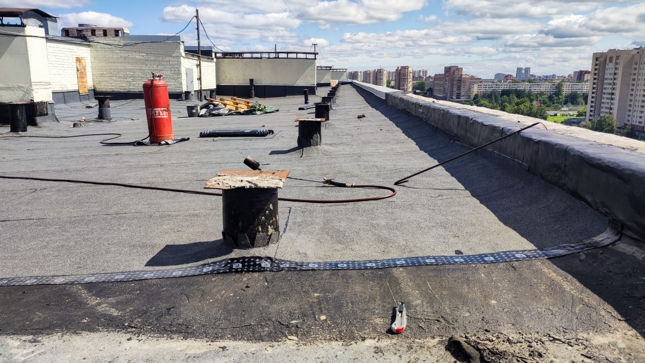 На фотографии изображена крыша многоквартирного дома, на которой проводится капитальный ремонт. На переднем плане виден рулон гидроизоляционного материала, инструменты и газовые баллоны. По всей поверхности крыши уложено новое покрытие. На заднем плане заметны элементы инженерных систем и соседние здания. Снимок отражает процесс замены кровли с применением современных рулонных материалов.