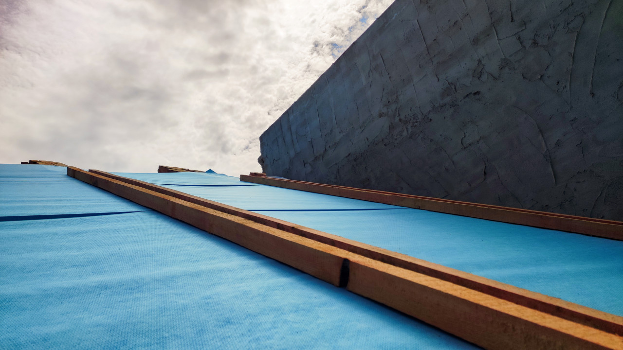 На фотографии показан фрагмент крыши здания, покрытой голубой гидроизоляционной мембраной. Сверху закреплены деревянные бруски, образующие обрешётку для последующего монтажа кровельного материала. На заднем плане видна стена здания с черновой штукатуркой, а также облачное небо. Снимок сделан в процессе строительных работ, объект культурного или исторического значения отсутствует. Фото можно использовать в материалах о строительстве, ремонте крыш, применении гидроизоляционных материалов и монтаже деревянных конструкций.