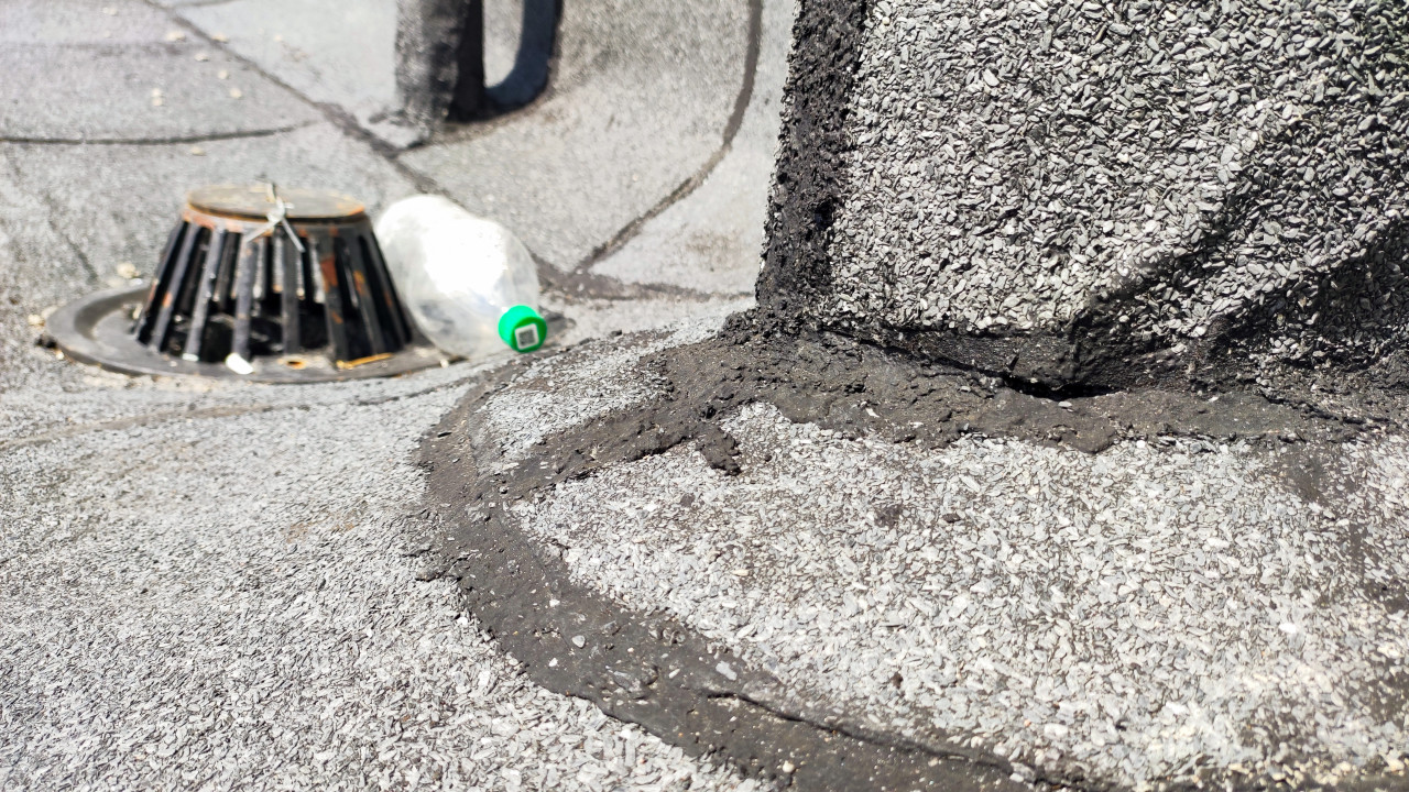Фотография фиксирует фрагмент кровли жилого дома, где виден водоотводящий трап с металлической защитной решёткой. Рядом расположены вентиляционные выходы, закрытые рубероидом, и кирпичная шахта инженерных коммуникаций. На покрытии заметны следы мастики, укрепляющей стыки рулонного материала. Вблизи трапа лежит пластиковая бутылка, оставшаяся после ремонтных работ, что указывает на текущий процесс обслуживания крыши. Снимок может использоваться в статьях и пособиях по эксплуатации зданий, строительных технологиях и технических осмотрах.