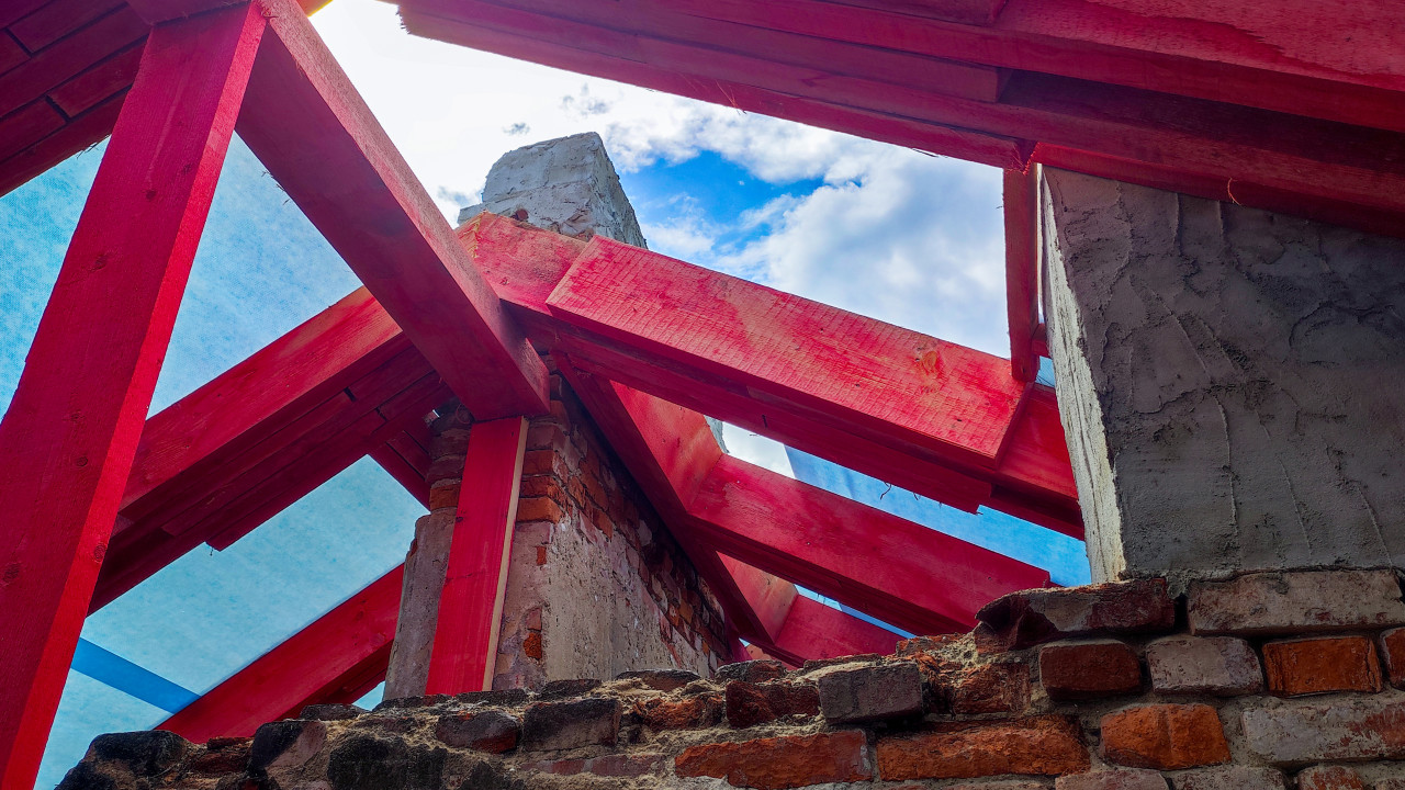 Фотография фиксирует участок крыши в процессе возведения: видны массивные стропильные балки, окрашенные в красный цвет и закреплённые на кирпичном основании. Балки поддерживают голубую гидроизоляционную мембрану, защищающую от влаги. На заднем плане просматривается облачное небо. Объектов культурной или исторической значимости в кадре нет. Изображение подходит для иллюстрации технологии монтажа стропильной системы и использования древесины в строительстве.