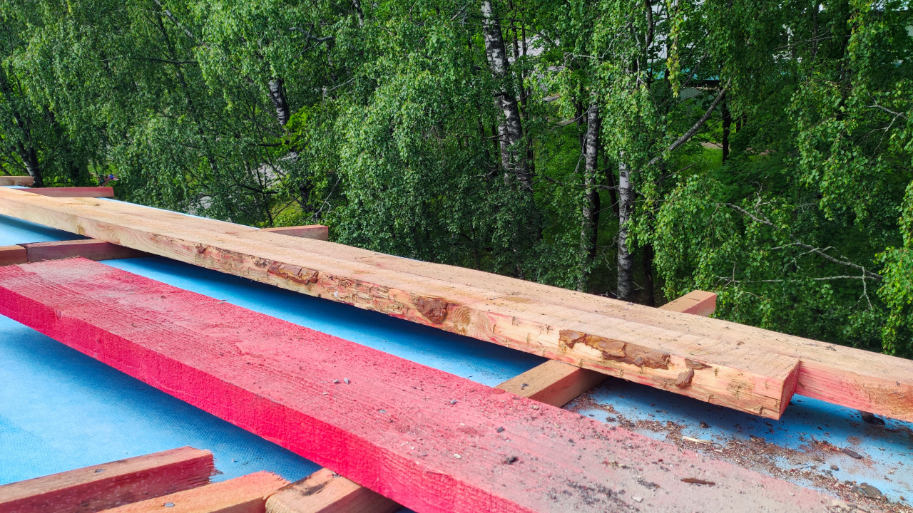 На фото изображён фрагмент крыши в процессе строительства. На голубой гидроизоляционной мембране уложены деревянные бруски, часть которых окрашена в красный цвет, а один из элементов имеет неровности и повреждения коры. На заднем плане видны зелёные лиственные деревья, указывающие на тёплое время года. Объектов культурного или исторического значения нет. Фотография может использоваться в статьях о строительных материалах, демонстрации этапов кровельных работ и иллюстрации качества древесины.