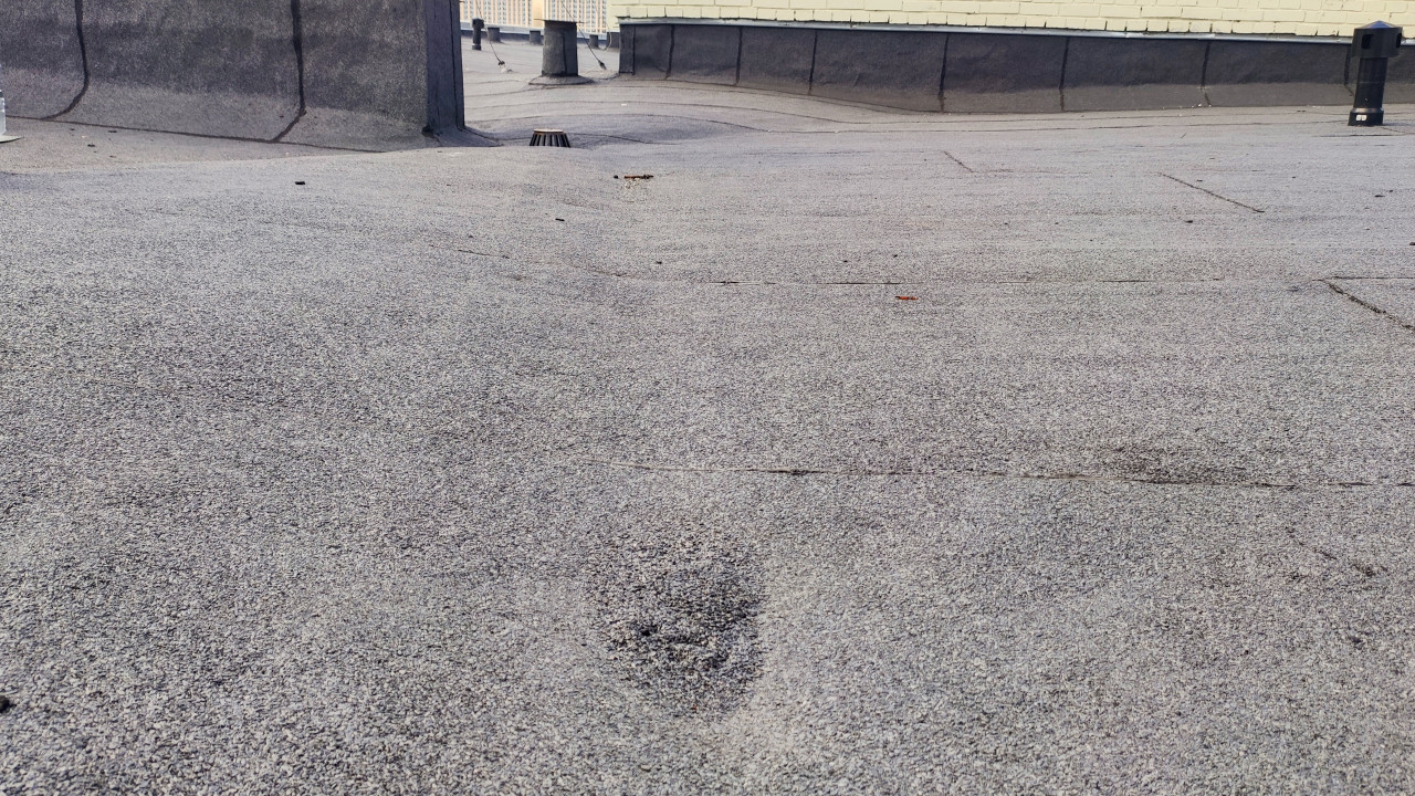 На изображении показана большая площадь плоской кровли многоэтажного здания. Видно ровное покрытие из рулонного материала, отдельные дефекты и элементы инженерных систем на заднем плане. Такой снимок может использоваться в материалах по эксплуатации домов, обследованию зданий и в статьях о кровельных технологиях.