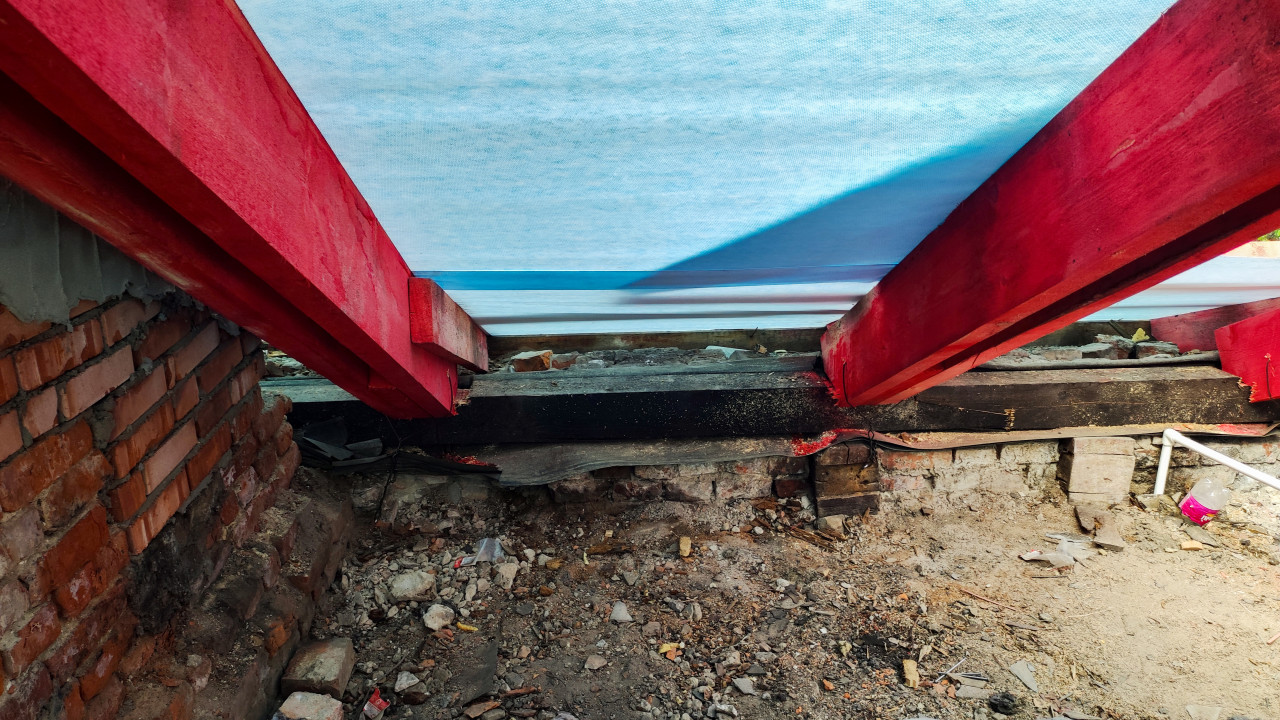 Фотография показывает внутренний угол крыши в процессе ремонта. Красные деревянные балки опираются на старую кирпичную кладку, поверх них уложена голубая мембрана. Внизу виден строительный мусор, части старых конструкций и пластиковая бутылка. Фото фиксирует сочетание старой основы здания и новых элементов кровли. Объектов культурной значимости нет. Снимок может быть использован для публикаций о реконструкции крыш и применении современных материалов в старых зданиях.