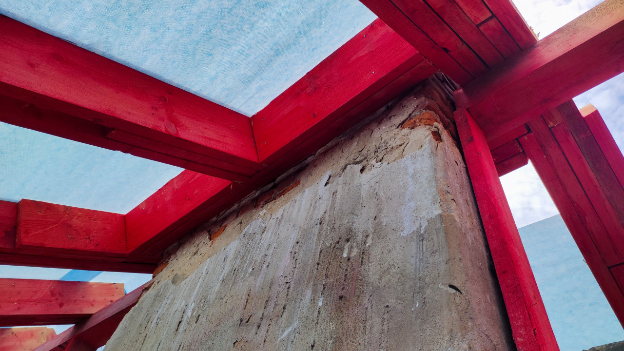 На фотографии показан фрагмент строящегося или ремонтируемого здания. На верхней части бетонной стены закреплены красные деревянные балки стропильной системы, перекрытые голубой гидроизоляционной мембраной. Камера направлена снизу вверх, что позволяет рассмотреть детали крепления. Объектов культурного или исторического значения в кадре нет. Снимок можно использовать для публикаций о строительных технологиях, монтаже стропил и применении современных материалов в ремонте кровли.