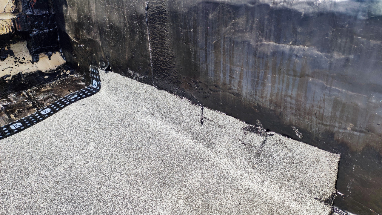 На фотографии изображён участок крыши многоквартирного дома с уложенным рулонным материалом, примыкающим к кирпичной стене. По стыку нанесён слой битумной мастики для обеспечения герметичности. Чётко виден технологический процесс изоляции швов. Снимок можно использовать для иллюстрации строительных работ, связанных с ремонтом и обслуживанием крыш.