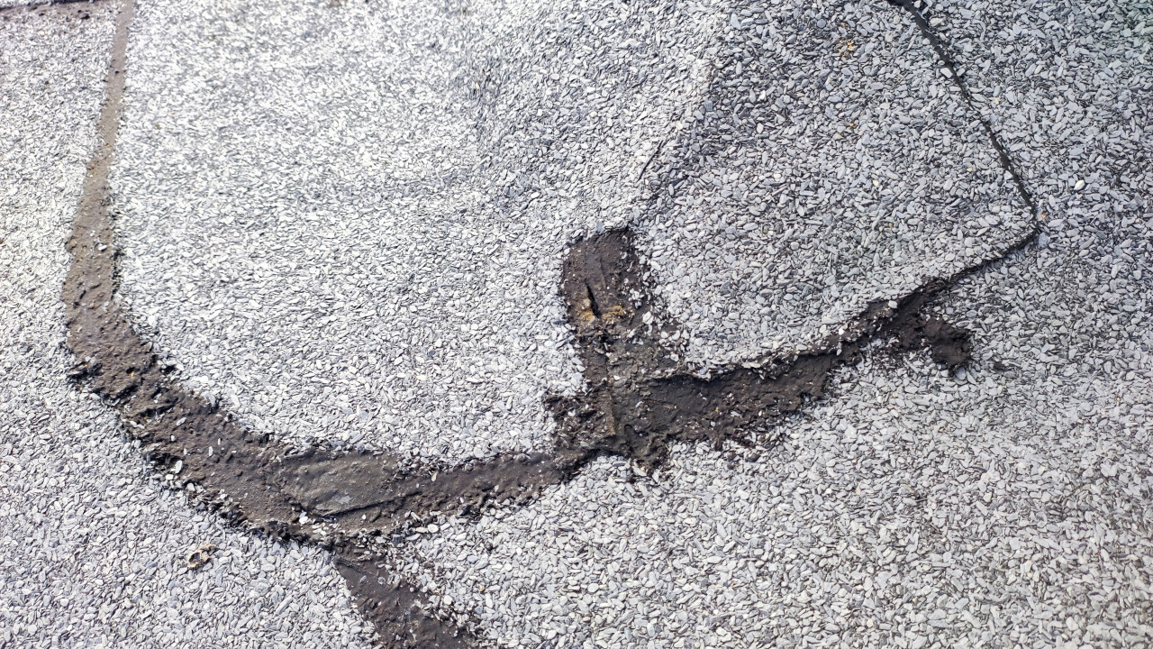 На изображении показан участок плоской кровли с локальным усилением покрытия: поверх основного полотна уложены дополнительные полосы, края которых промазаны мастикой. Гранулированная посыпка и границы старого и нового материала различаются по оттенку, что подчеркивает место ремонта. Кадр демонстрирует типовое решение по восстановлению герметичности в зоне узла без указания конкретных размеров и марок материалов. Снимок уместен для визуализации отчетов техобследования, чек‑листов по ремонту и методических материалов для персонала эксплуатационных служб.