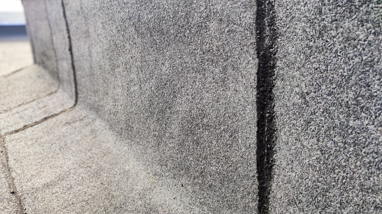 На снимке крупным планом показано примыкание рулонного кровельного материала к вертикальной поверхности. Видна линия спайки и темные следы битумной мастики. Такой элемент конструкции используется для защиты стыков от влаги и ветра. Фото может применяться в обучающих материалах для кровельщиков, строительных блогах и технических статьях по ремонту крыш.