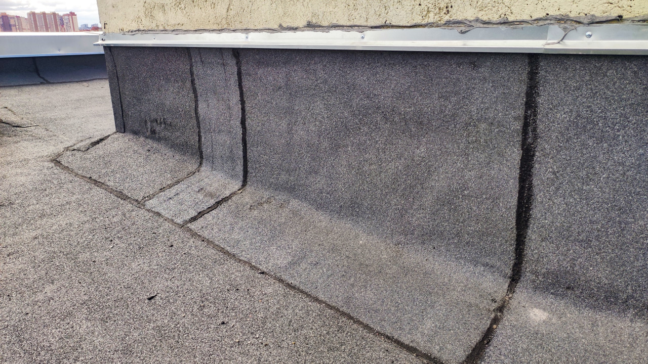 Изображен участок кровли, где слой рулонной гидроизоляции примыкает к вертикальной стене. Четко видно место стыка и обработка швов битумной мастикой. Такой узел важен для предотвращения протечек и сохранения целостности покрытия. Снимок может быть использован в инструкциях по монтажу кровли, в учебных материалах для строителей и в статьях о содержании многоквартирных домов.