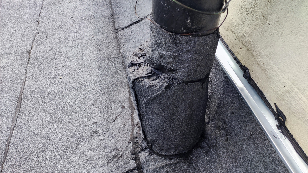 Изображение фиксирует участок кровли многоквартирного дома в месте примыкания рулонного покрытия к металлической трубе. Видна дополнительная изоляция и герметизация вокруг трубы с использованием мастики. Снимок иллюстрирует типовое техническое решение для герметизации проходов инженерных коммуникаций через плоские крыши. Подходит для строительных инструкций, технических статей и учебных материалов по эксплуатации и ремонту зданий.