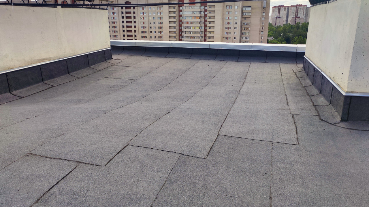 крыша ремонт крыши крыша здания износ кровельные работы ремонт кровли повреждения крыши кровля кровельное покрытие крыша дома плоская крыша рулонная гидроизоляция парапет примыкание галтель нахлест швы битумно полимерное покрытие герметизация эксплуатация зданий обслуживание домов строительные узлы монтаж кровли строительный контроль профилактика протечек изоляция городская застройка многоэтажный дом техническая fotografia ЖКХ строительные материалы обследование кровли техобслуживание узел примыкания плоская кровля учебный материалПохожие фотографии