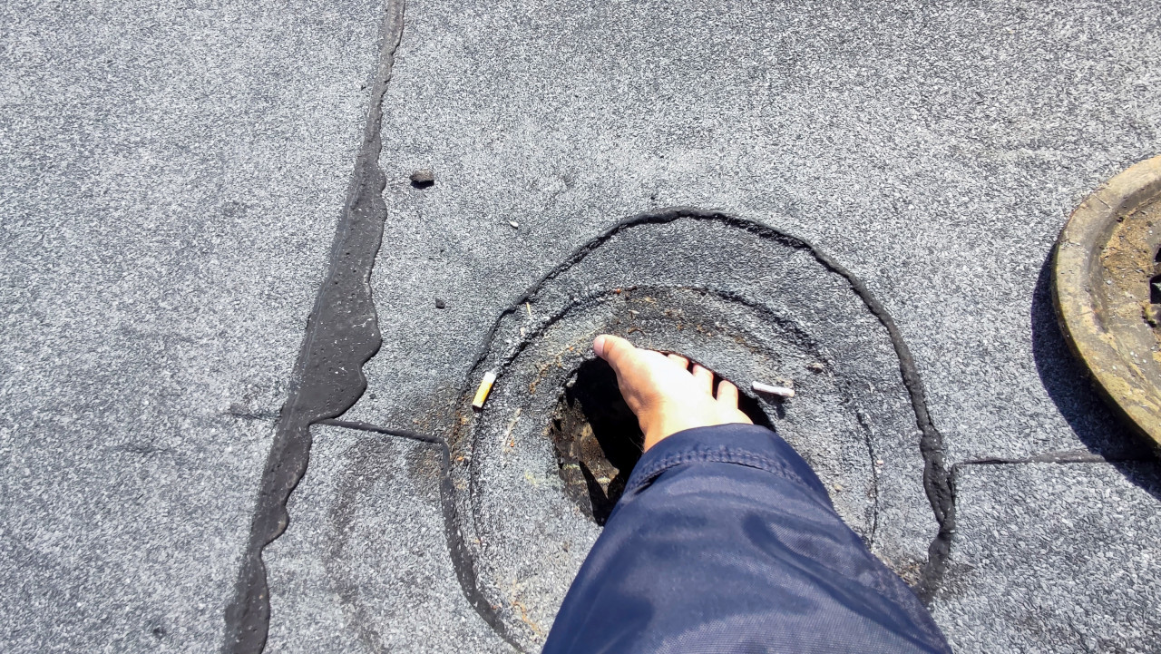 На изображении зафиксирован процесс осмотра водостока на плоской крыше. Человек в рабочей одежде демонстрирует масштаб отверстия, опуская руку внутрь сливного узла. Вокруг видны остатки мусора и окурки, а также следы герметизации по контуру. Поверхность крыши выполнена из рулонного материала с видимыми швами. Съёмка ведётся при дневном свете. Культурных или архитектурных памятников в кадре нет. Фотография может быть использована для материалов о строительстве, техническом обслуживании и диагностике инженерных систем зданий.