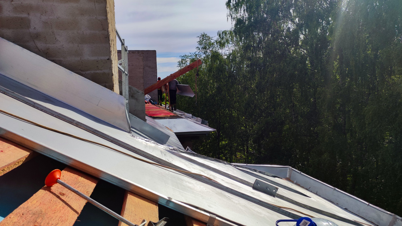 На фотографии показан процесс подъема и монтажа металлических листов при строительстве кровли. Двое рабочих находятся на крыше, используя деревянные направляющие для перемещения материала. На переднем плане видна часть крыши с закрепленными листами, а также инструменты и строительные элементы. На заднем плане заметны зеленые деревья, указывающие на проведение работ в летний сезон. Снимок иллюстрирует организацию труда на высоте и может применяться в статьях о строительных технологиях, ремонте зданий и безопасности при работе с кровлей.