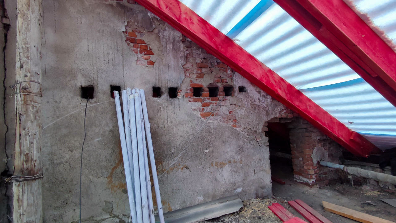 На фотографии запечатлен участок чердака во время капитального ремонта. На переднем плане видна кирпичная стена с проёмом и отверстиями, вероятно использовавшимися для вентиляции. Часть кладки осыпана, штукатурка частично утрачена. Слева закреплены деревянные балки и опоры, окрашенные красным антисептиком. На полу лежат деревянные доски и строительные материалы. Снимок иллюстрирует состояние старого здания в процессе восстановления и может быть использован в статьях о реставрации, строительных инструкциях и учебных пособиях.