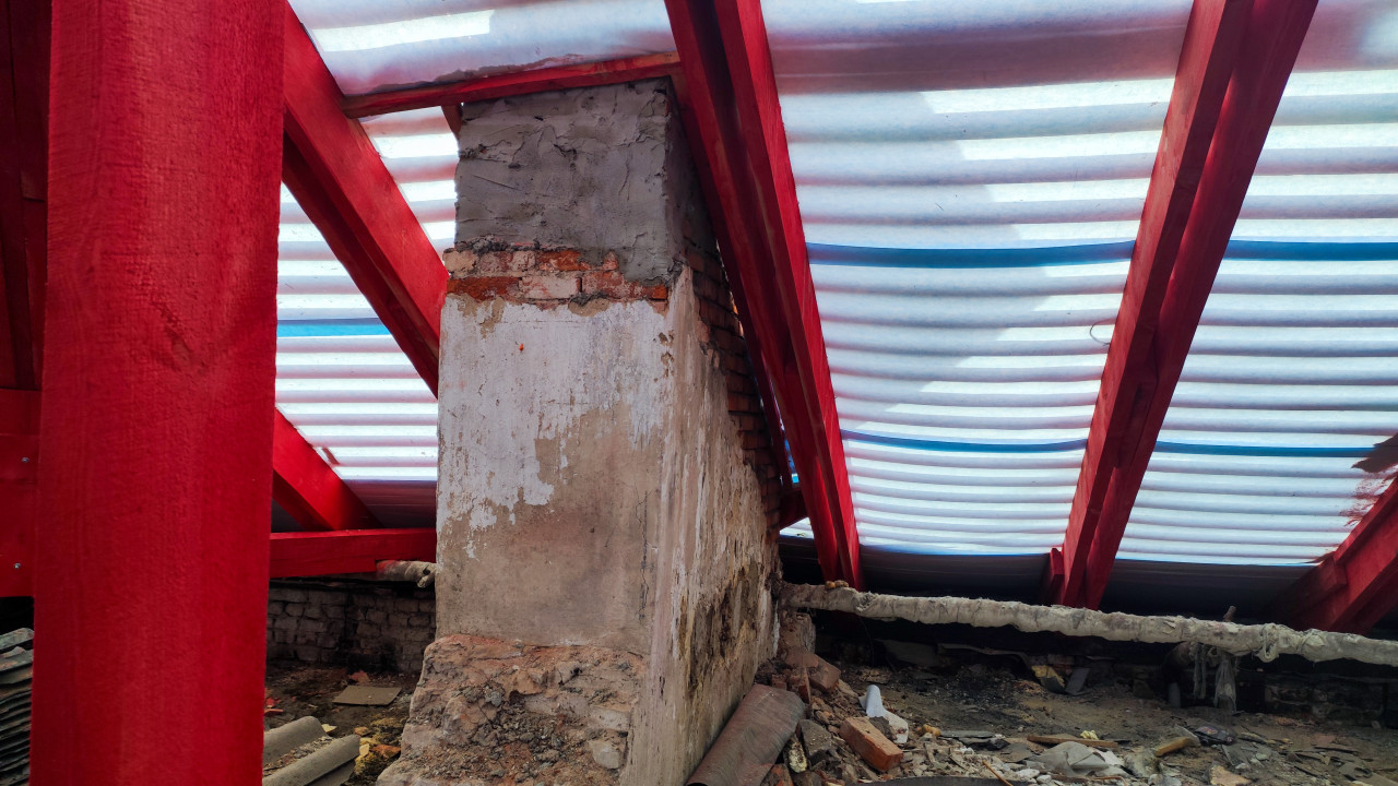 На снимке изображена часть чердака, где проходит реконструкция. Вдоль крыши закреплены новые деревянные стропила красного цвета, а в центре кадра находится старая кирпичная стена с частично осыпавшейся штукатуркой. На полу заметны строительные остатки, обломки и трубы. Фото фиксирует процесс ремонта и демонстрирует сочетание новых и старых элементов конструкции. Такой материал может применяться для технической документации и статей о восстановлении старого жилого фонда.