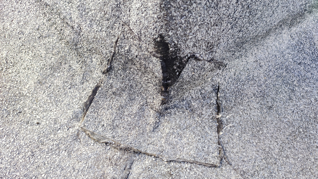На фото крупным планом показан дефект в месте примыкания рулонного кровельного покрытия к вертикальной поверхности. Видны трещины и неравномерное нанесение битумной мастики, что указывает на риск протечек. Подобные узлы характерны для многоквартирных домов с плоской крышей и требуют регулярного контроля состояния. Снимок подходит для использования в инженерной документации, обучающих материалах по ремонту крыш и публикациях о техническом обслуживании зданий.