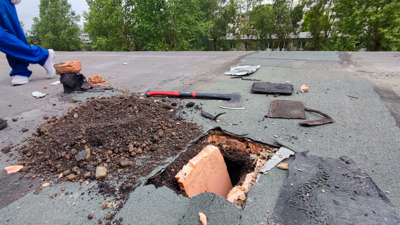 На фото изображено отверстие в кровельном покрытии кирпичного здания, окруженное кусками утеплителя и грунта. Рядом лежит топор, использованный для вскрытия слоя. На переднем плане заметны строительные материалы и мусор, на заднем — зелёные деревья. Снимок может быть использован для публикаций о строительной экспертизе, ремонте кровли и выявлении дефектов зданий.
