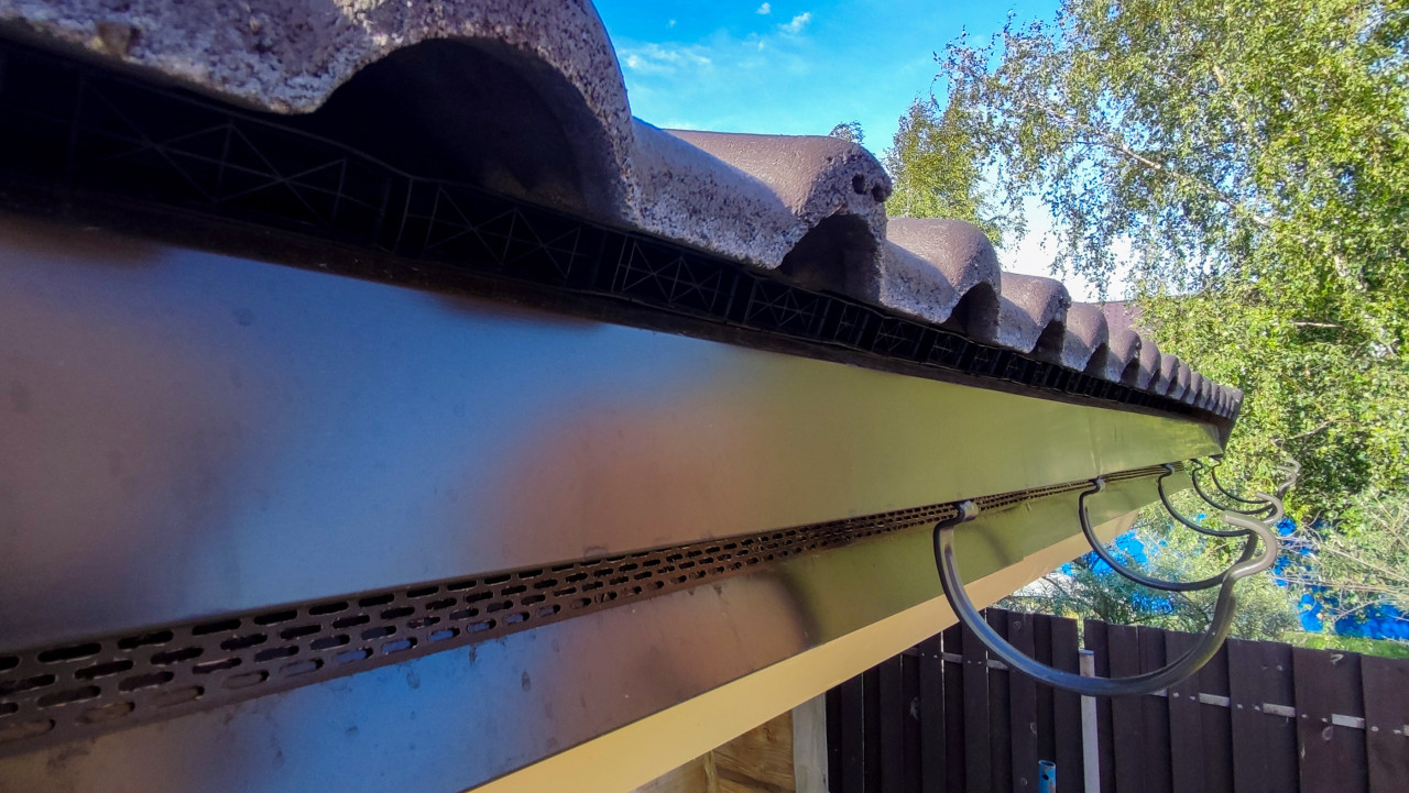 Фотография фиксирует фрагмент крыши с черепичным покрытием и установленными металлическими кронштейнами для монтажа водостока. Под карнизом видна вентиляционная решётка, обеспечивающая воздухообмен в подкровельном пространстве. На фоне — зелёные деревья и элементы ограждения участка. Изображение может быть использовано в материалах о строительстве, инженерных системах и устройстве кровельных конструкций.