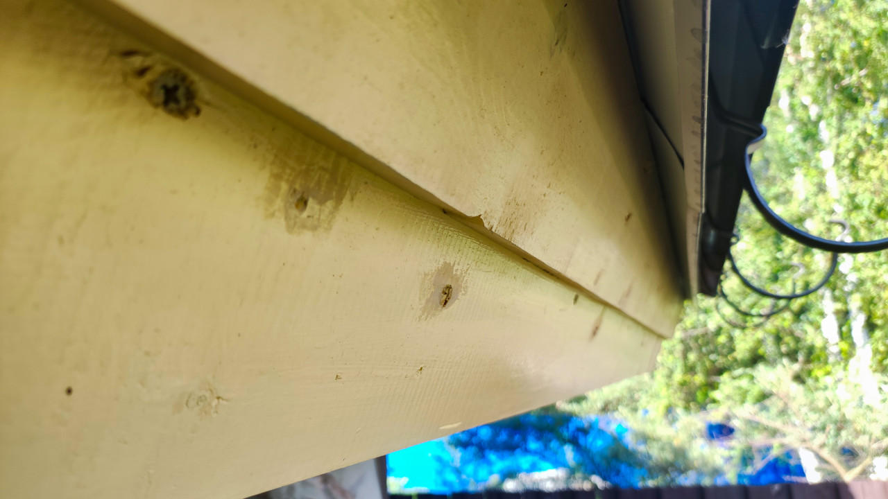 На фотографии показан нижний угол крыши частного дома с деревянной обшивкой, окрашенной в светлый цвет. Видны следы крепежа в виде шурупов и саморезов, часть из которых замазана шпаклевкой или краской. Съемка произведена снизу вверх, поэтому в кадре видна нижняя часть карнизного свеса и небольшая часть водосточной системы. На заднем плане просматриваются кроны деревьев, создавая контраст между строительными элементами и природным окружением. Изображение может быть использовано в материалах о строительстве, ремонте фасадов, монтаже кровли и уходе за деревянными конструкциями.