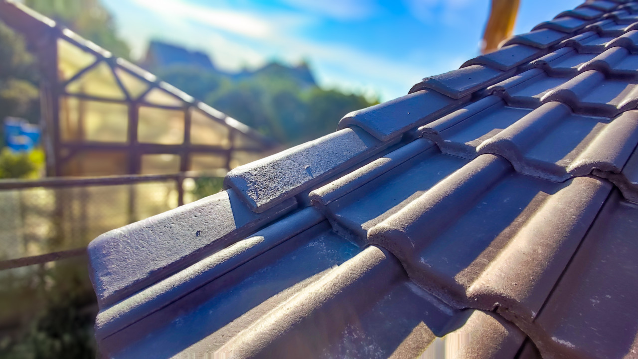 На фотографии показан край крыши частного дома, покрытой керамической черепицей темного цвета. Видны ряды плиток, уложенные по скату, а также часть теплицы или хозяйственной постройки на заднем плане. Съемка произведена под углом, что позволяет рассмотреть геометрию черепицы и линию свеса. Изображение может использоваться для иллюстрации строительных технологий и материалов.