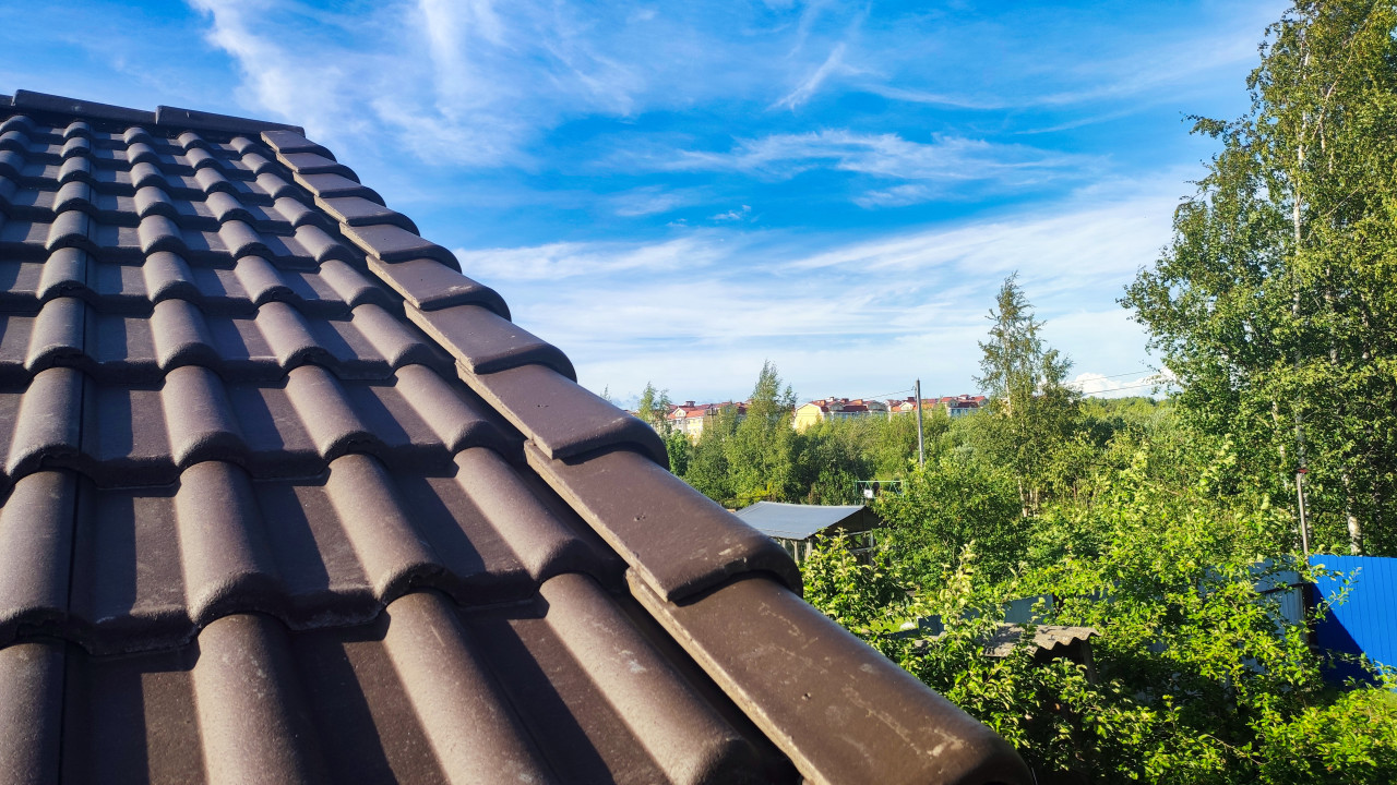 Фотография фиксирует угол крыши частного дома, покрытой тёмной черепицей. На переднем плане видны ряды кровельного материала, а на заднем — зелёные деревья и участок жилого района с домами. Снимок сделан с верхней точки и демонстрирует сочетание крыши и окружающего ландшафта. Фото может быть использовано в материалах о строительстве загородных домов, выборе кровельных материалов и архитектуре индивидуального жилья.
