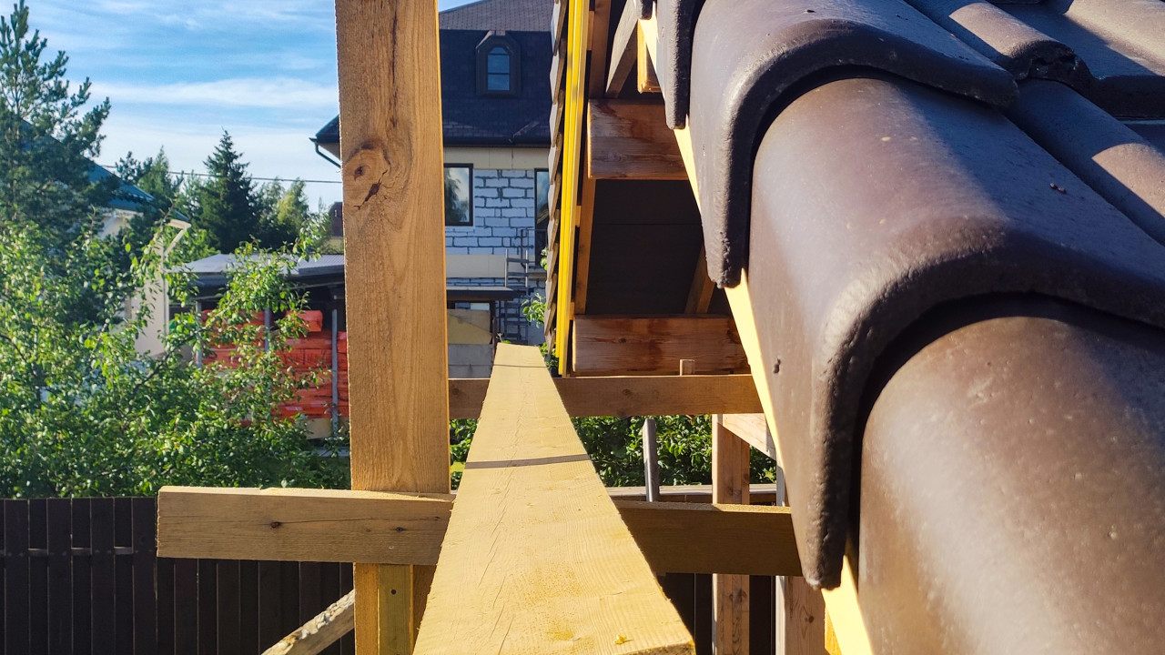 Фотография фиксирует процесс строительных работ возле крыши, покрытой керамической черепицей. Видна деревянная конструкция с настилом из досок и элементы лесов для монтажа. В кадре показан боковой свес крыши, закрытый рядами черепицы, а на фоне — частный дом и зеленые деревья. Снимок иллюстрирует строительные работы на завершающем этапе монтажа крыши.