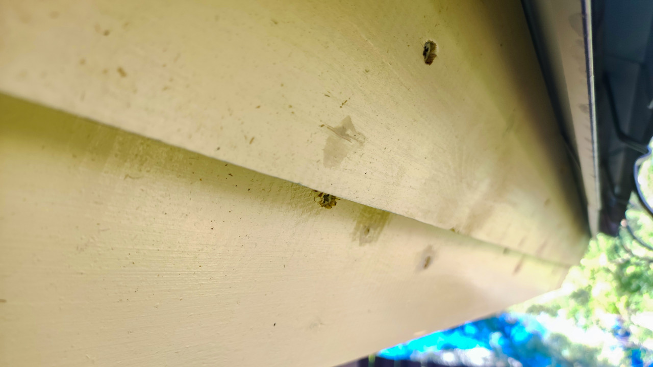 На фотографии изображен деревянный элемент карнизного свеса дома, окрашенный в светло-желтый цвет. В кадре видны несколько отверстий от саморезов и следы шпаклевки, нанесенной на места крепежа. Съемка произведена снизу вверх, что позволяет рассмотреть структуру дерева и монтажные элементы. На фоне заметны зеленые деревья и часть крыши. Данное изображение отражает процесс отделки и ремонта деревянных конструкций, может использоваться для иллюстрации технологий монтажа и ухода за фасадами загородных домов.