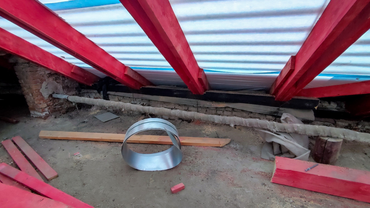 На фото изображен чердак старого жилого здания в процессе ремонта. Видны красные деревянные стропила, установленные под крышей из полупрозрачных листов. На полу размещены доски, кирпичи и металлический элемент в виде кольца. Вдоль стены проходят старые трубопроводы, частично поврежденные и утепленные тканью. Снимок фиксирует состояние чердачного пространства и процесс подготовки к реконструкции, может использоваться в статьях о ремонте и восстановлении зданий, строительных инструкциях и материалах по технике безопасности.